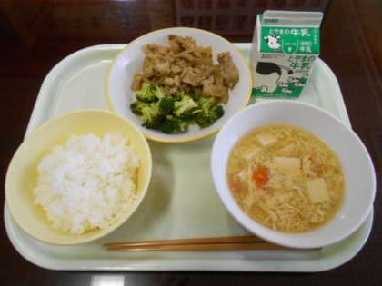 今日の給食は、ごはん、牛乳、豚肉のジャンロー、ゆでブロッコリー。かき玉汁です。