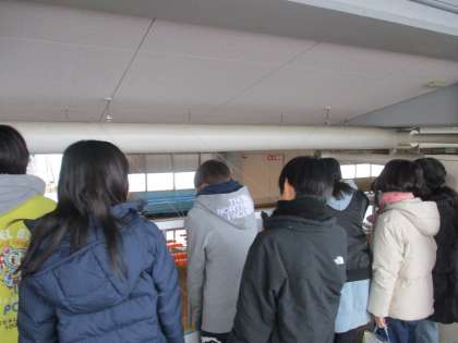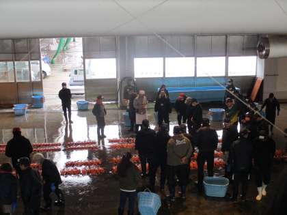 新湊きっときと市場では、昼セリの見学をしました。紅ズワイガニがきれいに並べられ、セリが始まるとものすごい勢いでどんどん買い手が決まっていく様子は圧巻でした。その後、市場の方から説明を聞きました。