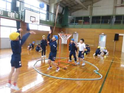 360°どこからでもシュートを打てるようにゴールを設置することで、ゴールが決めやすくなります。ゴールの近くからシュートを狙ったり、守りから離れてシュートしたり、攻撃の仕方を工夫していました。ふんわりシュート、フェイントシュート等、身に付けたシュートの動きを生かし、総当たり戦を行いました。30秒ごとに攻守を入れ替えルことでスピード感も出て、ゲームを楽しむ姿が広がりました。