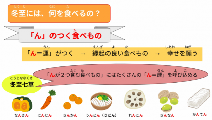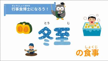 今日の給食は、冬至メニューです。ごはん、牛乳、鯵のみりん焼き、柚子あえ、ほうとう鍋です。冬至と言えば柚子です。そして、ほうとう鍋にはカボチャがたっぷり入っていました。栄養教諭の作った動画を見ながら給食を食べました。ちなみに、今年の冬至は12月21日(土)でした。