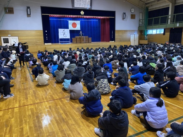 雪が積もる中でしたが、新保っ子は元気に登校しました。子供たちの笑顔が学校に戻ってきました。全校そろって体育館で第3学期始業式を行いました。