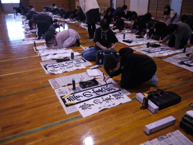 5年生は「水清き里」、6年生は「夢の実現」と揮毫しました。限られた枚数の中で、これまでの練習の成果を発揮しようと、一画一画、筆遣いを確かめながら真剣に取り組んでいました。