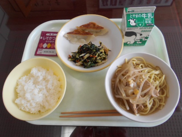 ごはん、牛乳、焼きぎょうざ、鉄たっぷりサラダ、サッポロラーメン、しそかつおふりかけです。鉄たっぷりサラダは、ひじきがたっぷり入っています。今シーズン一番の冷え込みになり、あたたかいサッポロラーメンは嬉しい限りです。密閉保温容器に入ったスープは、教室で配膳直前に開けるので、温かさが保たれています。