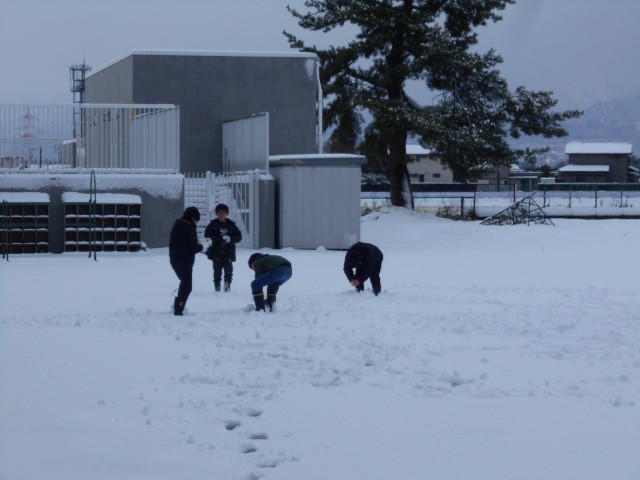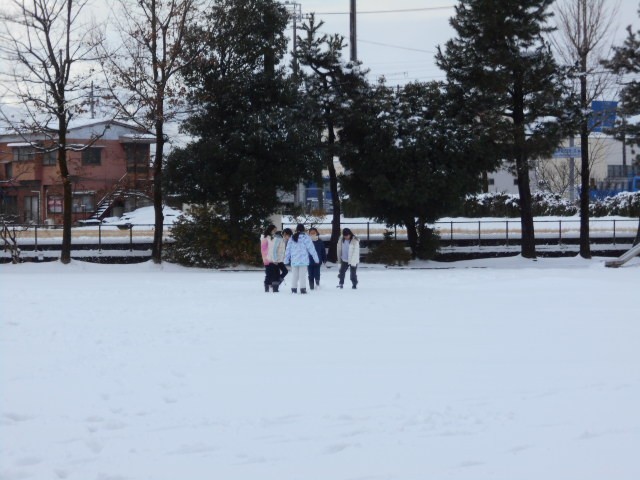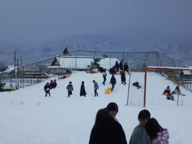 グラウンドは15㎝ほどの積雪があり、新保っ子は寒さに負けずに飛び出していきました。そりで滑ったり、雪合戦をしたり、雪だるまを作ったりしていました。