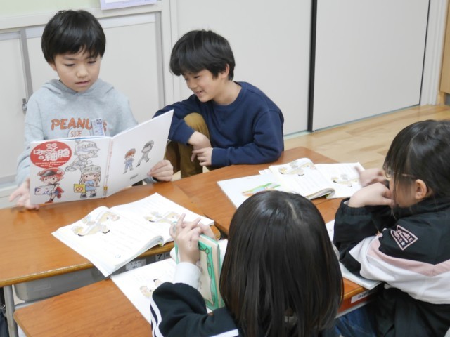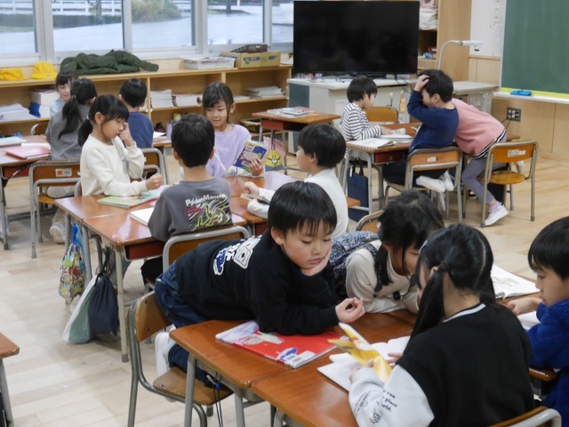 国語の学習で友達にお気に入りの本を紹介しました。図書室で借りた本、小さい頃からすきな本をどんなところが面白いか話しました。話を聞いて、もっとくわしく知りたいことを友達に質問しました。最後には本を交換して読み合いました。
