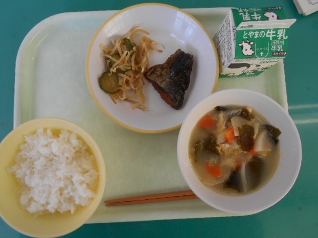 ごはん、牛乳、あじの蒲焼き、もやしのおひたし、高野豆腐のみそ汁です、