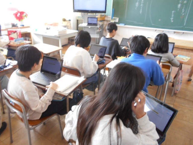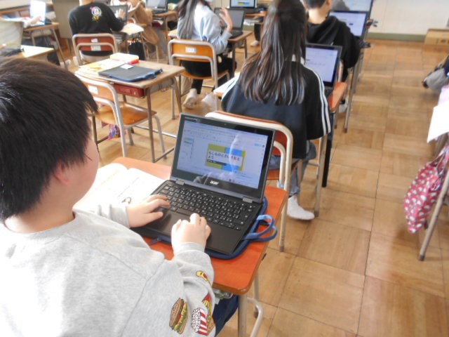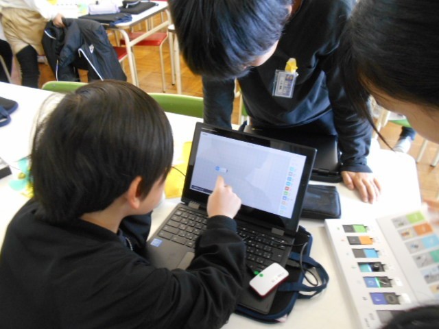 5年生が「Mesh」という教材を使ってプログラミング学習をしました。光センサーや温度センサー、人感センサーを設定して、自分が思ったと通りに明かりや音を鳴らすプログラムを作っていました。(中段)4年生は、国語科で学習したこと、考えたことを。GoogleWorkスペースのスライドを使ってまとめていました。(下段)