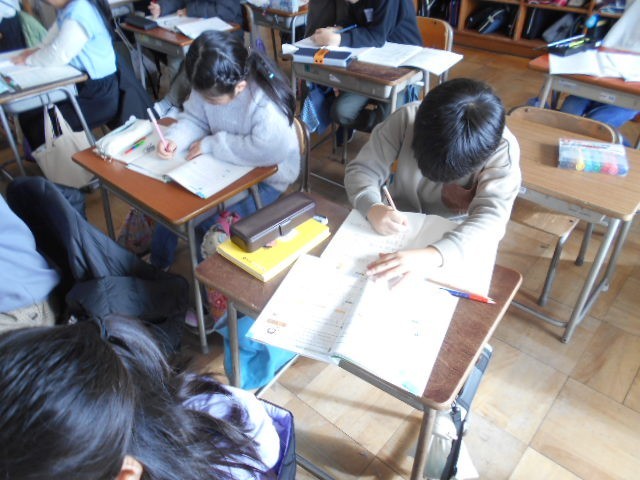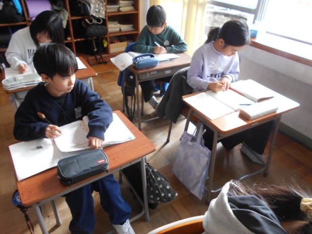 一人1台端末を活用した学習を取り入れていますが、4年生のスライドづくりも実は、ノートに書いた自分の考えを見ながらスライドをつくっています。(4枚目)また、3年生は、算数科でしっかりとノートを書いています。(5,6枚目)ノートは「自分の考えの基地」です。いくらICTが普及しても、文字や文を書くことはなくなりません。書くことには必ず「思考」が伴います。考えて書く「ノート」と共有や共同編集ができる「デジタル」のよさをうまく取り入れベストミックスで授業を行うようにしています。