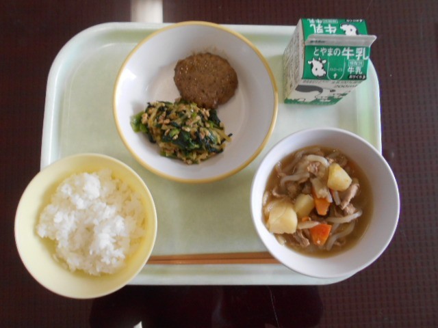 ごはん、牛乳、鶏つくね、納豆和え、豚肉の南蛮煮です。