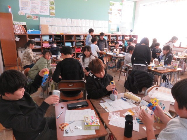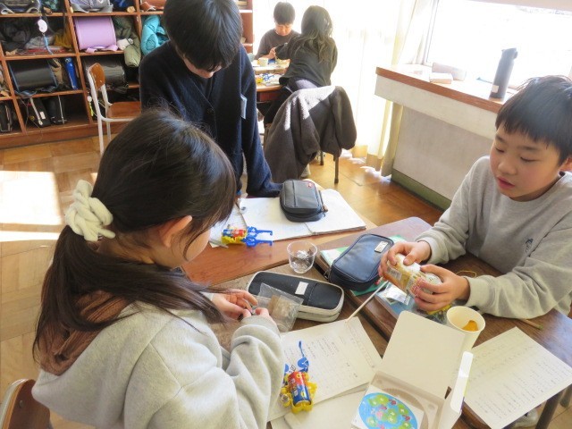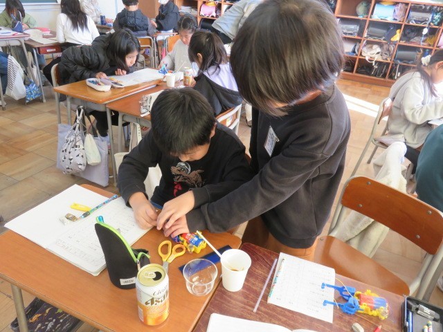 3年生:電気を通すものを調べよう:1月21日(火) 公開日 2025/01/21 更新日 2025/01/21 3年生の部屋 回路の途中に調べるものをつなぎ、豆電球が付くかどうか、調べます。身の回りにある15種類のものを調べました。はさみの種類で電気を通すものと通さないものがあったり、空き缶の表面をやすりで削ると電気が通ったり、友達と情報を交換しながら実験をしていました。 +1
