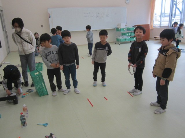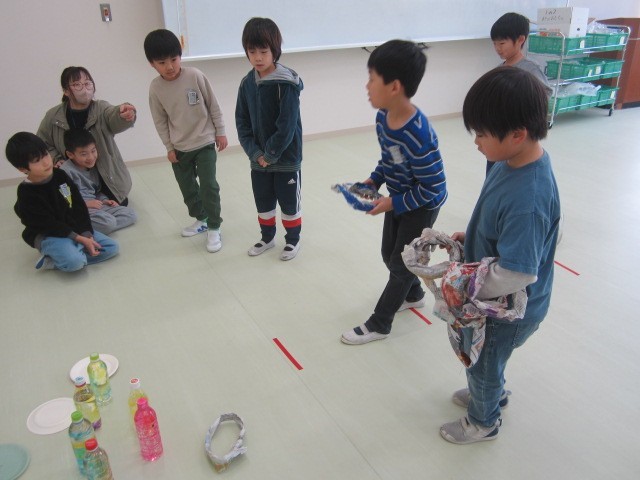 来週の「新保小なかよしフェスティバル」に向けて、準備をしています。今日はお店屋さん役、お客さん役に分かれて、実際に体験してみました。「どこから輪投げを投げますか?」「こんなふうにするよ」と優しく声をかけ、年長さんにも分かりやすいように説明する練習をしていました。来週のフェスティバルが楽しみです。