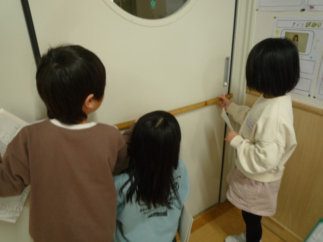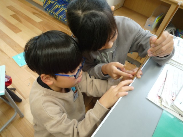 算数科の学習では、長い長さについての学習をしています。今日は、1mぐらいの長さのものを予想して実際にはかってみました。子どもたちの予想は、黒板のたて、ドアの横幅、テレビの横の長さ、先生の机の高さ等がありました。ものさしが長くて目盛りが読みにくい時には、友達と協力しながら活動に取り組んでいました。「1mって意外と長かった」「思ったよりも短くてびっくりした」と振り返っていました。