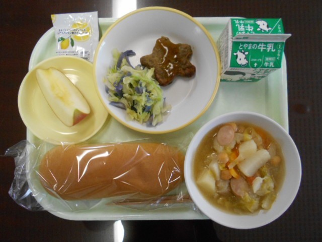 コッペパン、牛乳、サイエンスサラダ(レモンドレッシング)、星形ハンバーグ、根茎葉のポトフです。