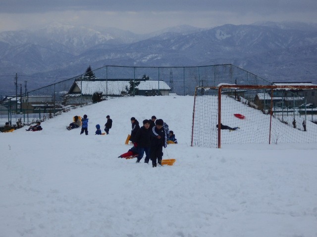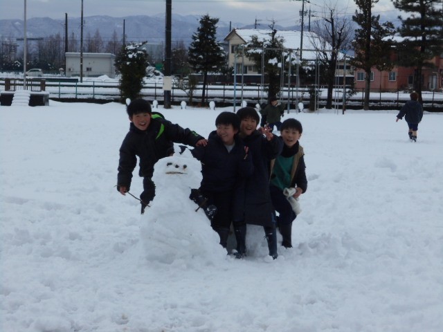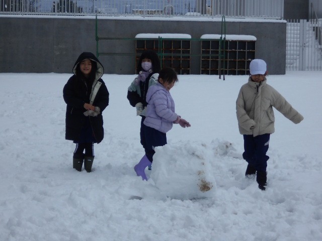 久しぶりにまとまった雪がグラウンドに積もりました。そりで滑る子、雪だるまをつくる子、雪合戦をする子と、思い思いに雪にふれ感触をたのしんでいました。