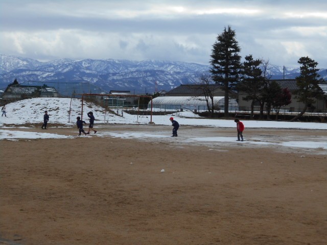休み時間に、少しだけ残っていた雪の感触をたのしんでいる様子です。朝の冷え込みで凍った状態の雪の上に乗る感覚は、いつもの感覚と違うはずです。こんなところにも学びがあります。