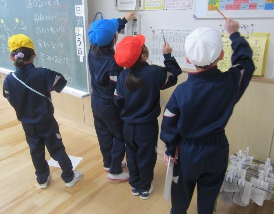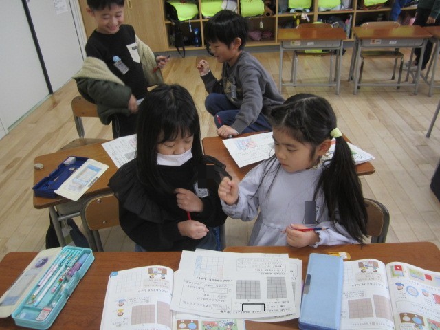 算数の学習では、学んだことを活かして、身の回りにある大きな数を数えたり、陣取りゲームをしたりしています。数調べでは「教室の中に90の数ってあるのかな?画鋲の数はどうかな?」といろいろな数に注目して数えることを楽しんでいました。また、陣取りゲームではマスの数を数えることで広さを比べられることを実感していました。