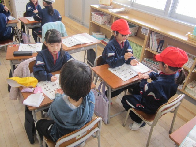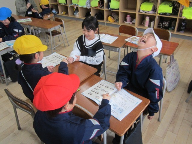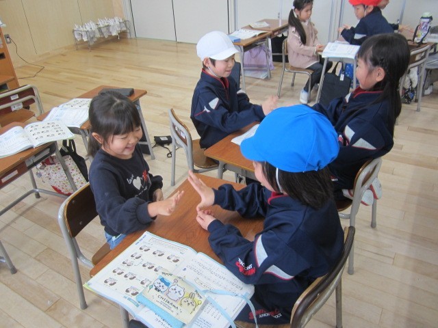 わらべ歌の「おちゃらかほい」をしています。音楽に合わせながら、友達とジャンケンをするのが楽しいようで、「また、あいこだー」「やったー!やっと勝てた!」と盛り上がっています。