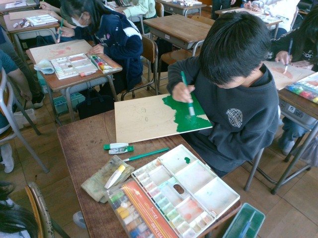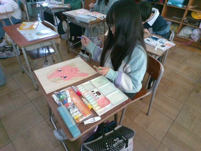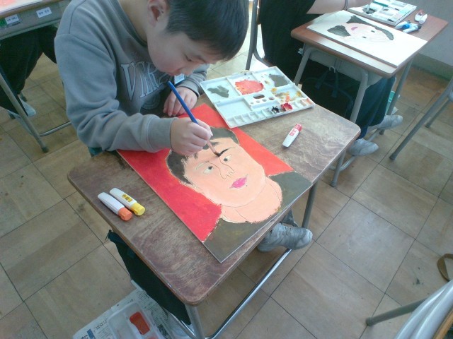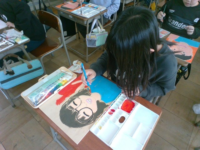 4年生:図画工作科「ぼく・わたしの顔」:2月5日(水) 公開日 2025/02/05 更新日 2025/02/05 4年生の部屋 図画工作科の学習で版画に取り組んでいます。子供たちは彫りの作業を終え、色付け作業をしています。肌の色や髪の色、背景の色等、工夫しながら色を塗っていました。金曜日はいよいよ刷りの作業になります。どのような作品になるのかとても楽しみですね。 +1