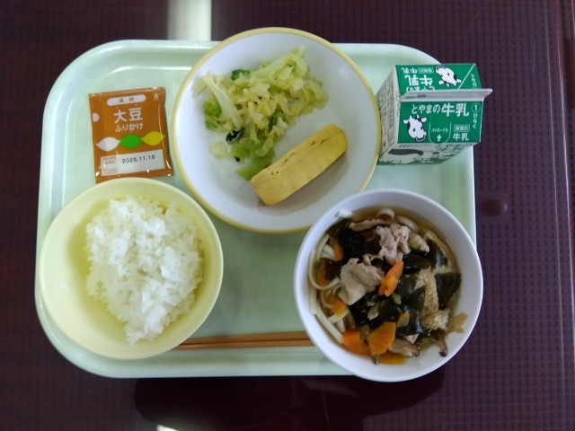 ごはん、牛乳、厚焼き卵、あわせ合え、五目うどん、大豆ふりかけ、です。