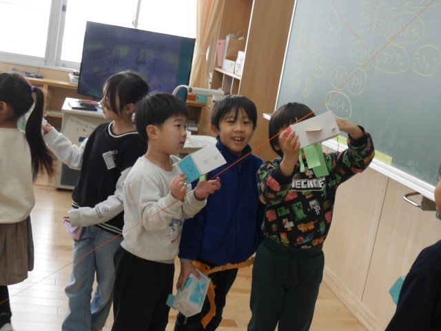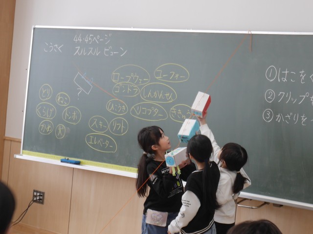 1年生:図工「スルスルビューン」:2月19日(水) 公開日 2025/02/19 更新日 2025/02/19 1年生の部屋 工作の学習に入りました。すべる仕組みをつかって、どんなものがすべるとおもしろいかを考えながら作りました。バスや新幹線などの乗り物、猫やリスなどの生き物、それぞれ自分のつくりたいものを表現しました。みんなですべらせて遊ぶのが楽しみです。
