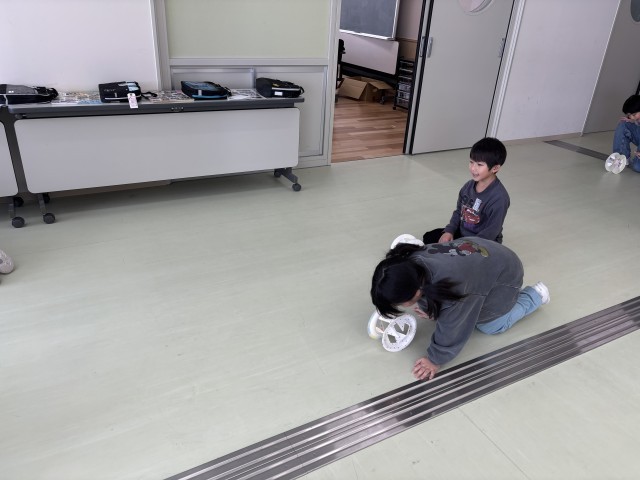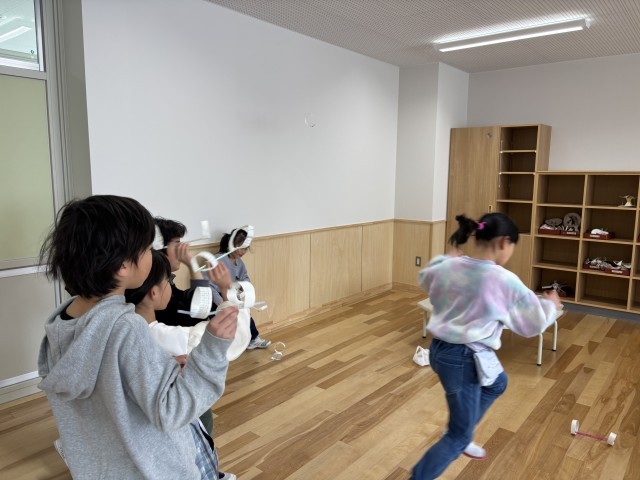 生活科で風をつかって動くおもちゃを作りました。風車や風輪、ストローひこうきを作った後、試しに動かしてみました。うまくいかないときこそ、考えるチャンスです。「テープを貼る位置を変えてみたら遠くまで飛んだ!」「そっと投げるといいよ」と遊びながら試行錯誤しながら楽しんでいました。