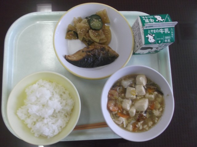 ごはん、牛乳、ふくらぎの西京焼き、華風和え、エビと豆腐のうま煮