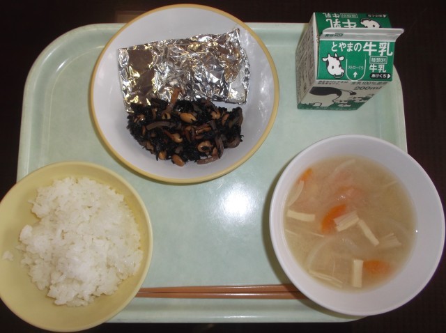 ごはん、牛乳、さばの銀紙焼き、ひじきの炒め煮、五目汁