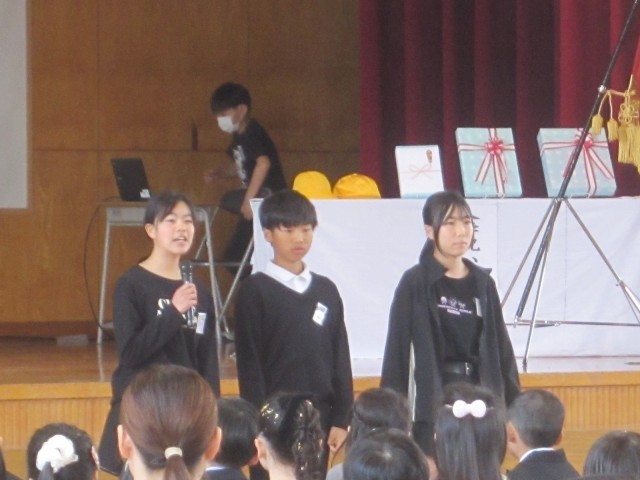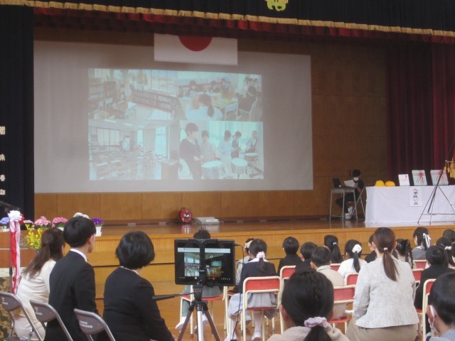 44名の新保っ子が入学しました。入学式の後の歓迎会では、6年生から新保小学校の1年間や楽しい行事についての紹介がありました。また、式に参加した5・6年生から歌「にじ」のプレゼントがありました。