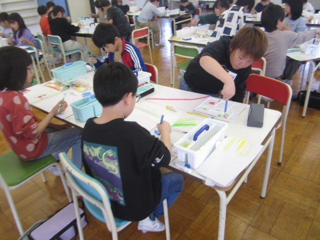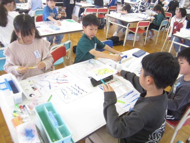 3年生に初めての図画工作の授業は、学年みんなで水彩を楽しみました。水を付けずに線を描いたり、水を多くして淡い色を楽しんだりしながら、自由な作品が出来上がりました。