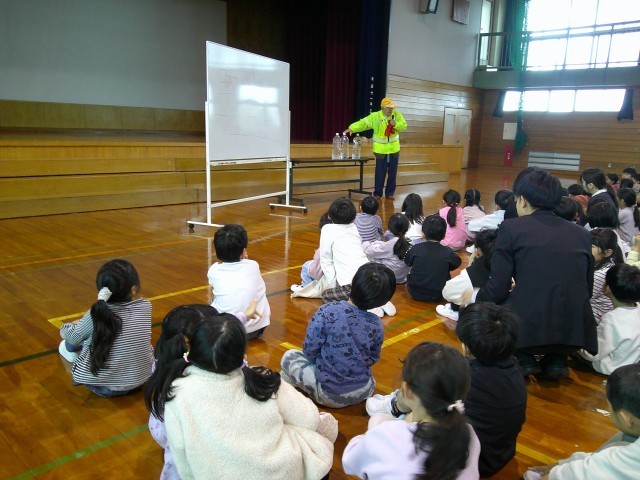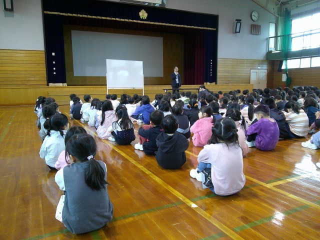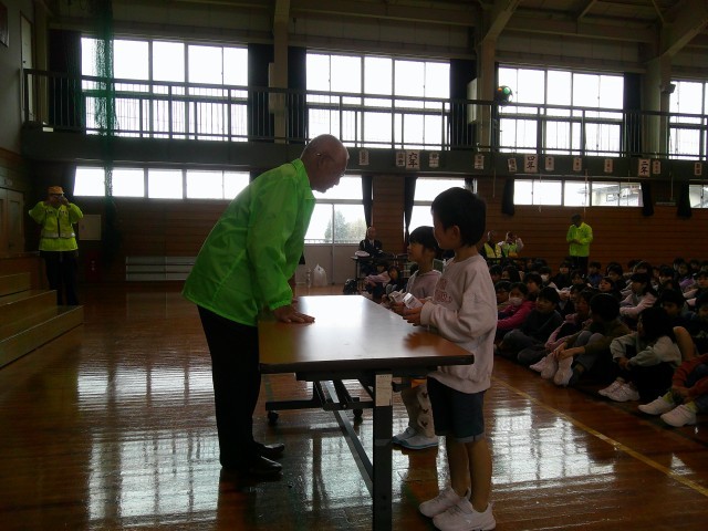 今日の2時間目に「交通安全・防犯教室」を行いました。あいにくの天気のため、実際に外で歩くことはできなかったのですが、命は1つ!車にも、不審者にも十分気を付けて生活していきましょう。また、いただいた防犯ブザーも活用してください。
