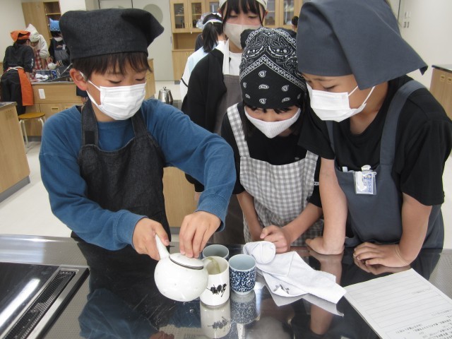今日は、2組が初めての調理実習に挑戦しました。お茶の味は美味しいと感じる子供もいれば、薄くて苦手と感じる子供もいました。グループでスムーズに活動を進め、みんなが時間内に終えることができ、初めてとは思えない手際の良さでした。ぜひ、お家の人にも作ってみてくださいね。