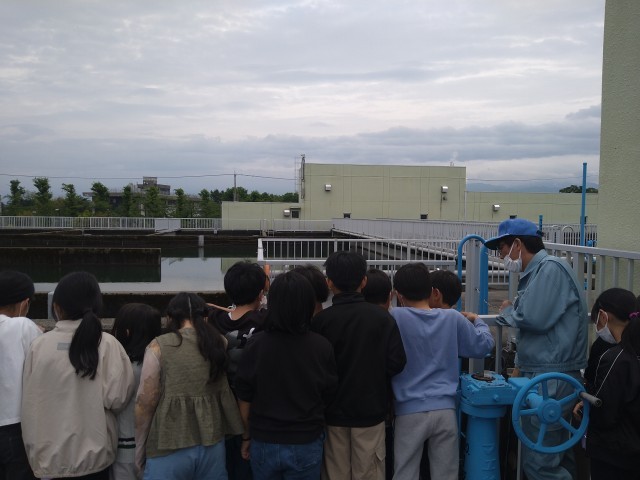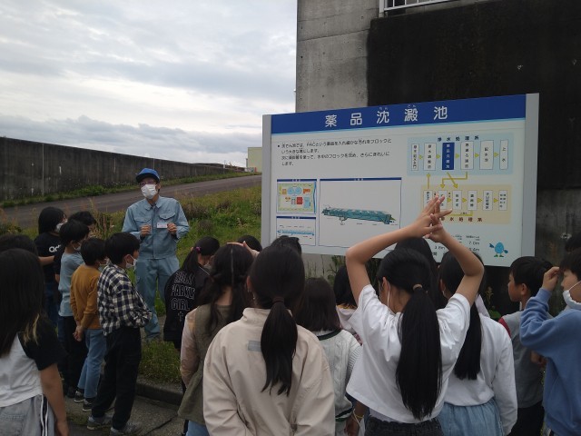 流杉浄水場では、川から引き込んだ水が外で順々にろ過や砂の沈殿、消毒をする様子を見学しました。また、映像を見て、施設全体について説明を聞きました。