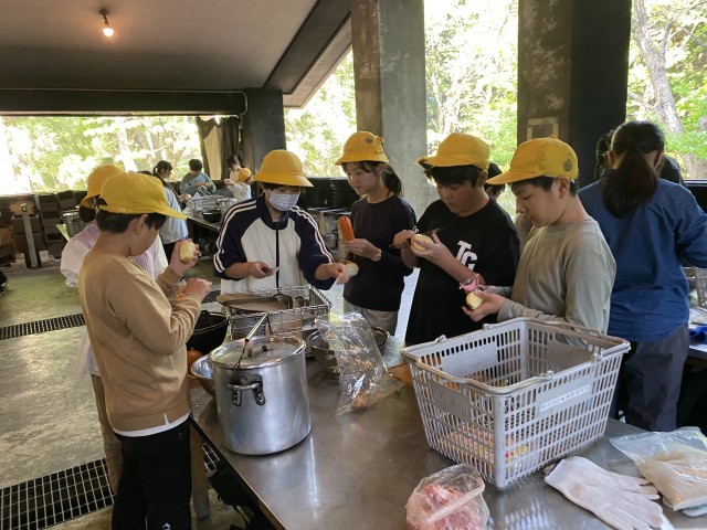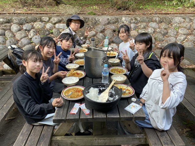 野外炊飯を行いました。火おこし体験でおこした火種でカレーライスを作りました。火おこし体験の残り時間が迫る中、「もう少しもう少し!がんばれ!!」とグループの歓声が湧き上がり、火がついたときには拍手がおこっていました。