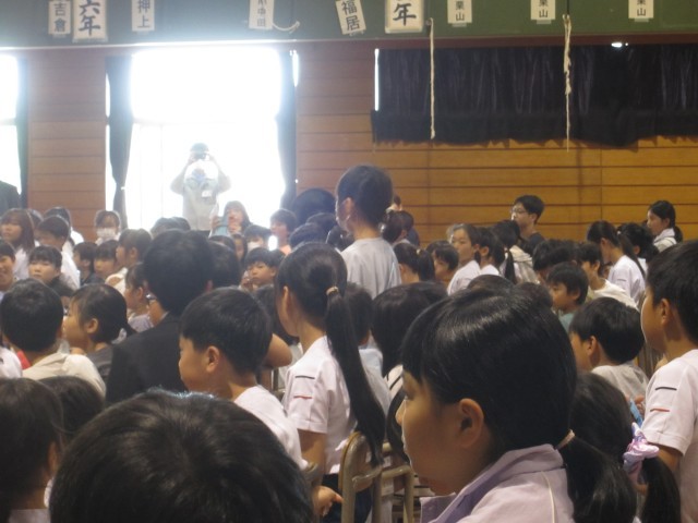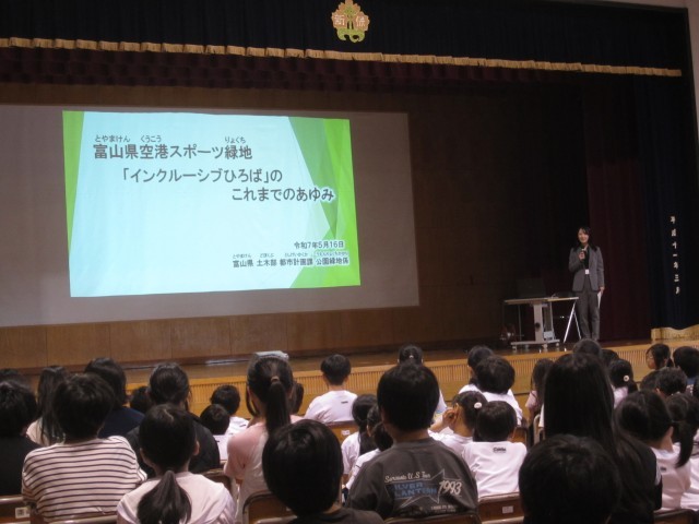 今日は「インクルーシブひろばをもっと良くしよう~どうすれば、みんなが楽しく遊べるかな?~」をテーマに、県公園緑地課やインクルーシブひろば会議委員の方々にご来校いただき、全校のみんなで「インクルーシブひろば」について考えました。