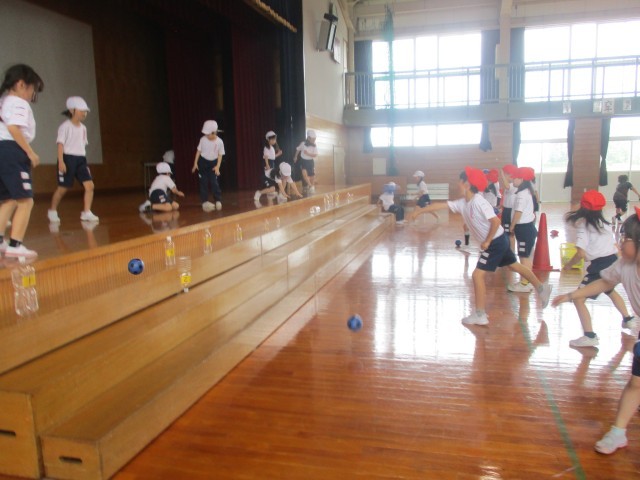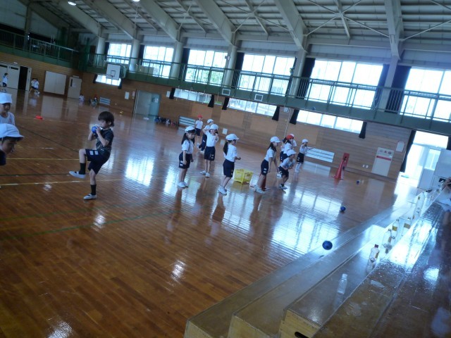来週行う、スポーツテストのソフトボール投げに向けて練習をしました。大小様々な大きさのペットボトルやバスケットボールのボードを的にし、目標目がけて「えいっ」。的になかなか当たらなくても、何度も挑戦し、がんばる姿が見られました。