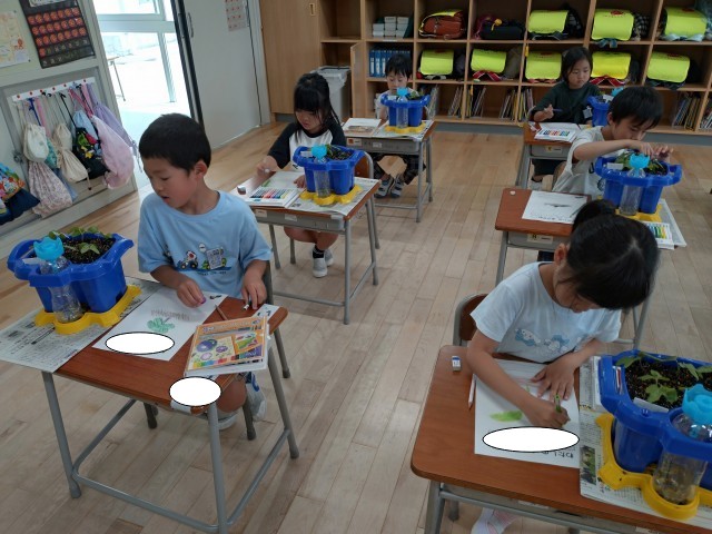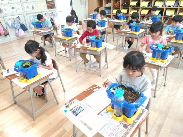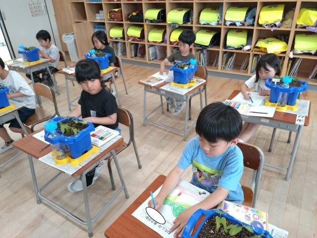 今日は、あさがおの芽の観察をしました。葉の色や形、模様をよく見て、観察カードに書いていました。