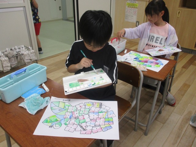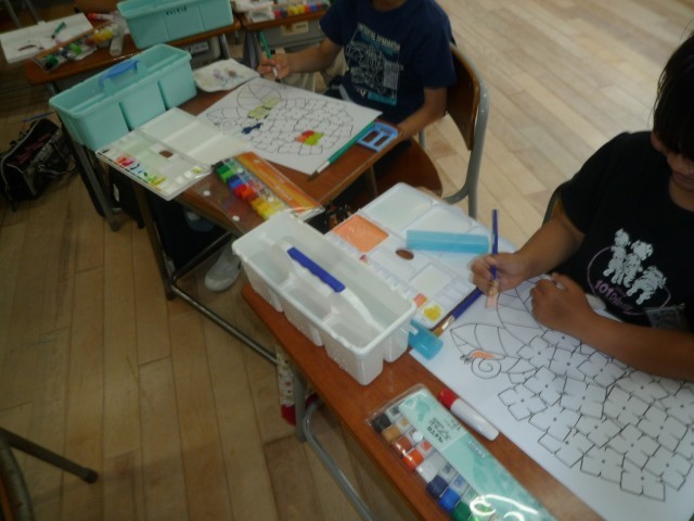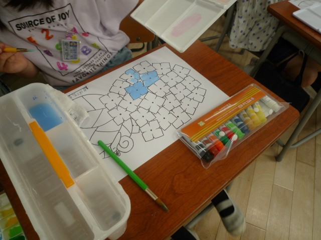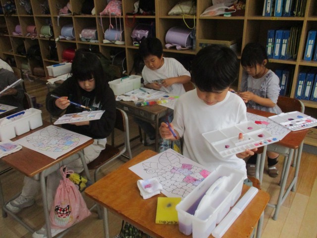 これから、アジサイが美しい季節になります。図画工作科では、何色にも色を変えるアジサイをイメージし、水彩で色を付けました。2色の絵の具を混ぜて新しい色を作ったり、水の量を調整したりするなど、色づくりや色塗りを楽しみました。