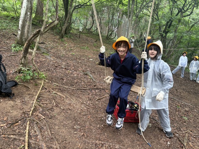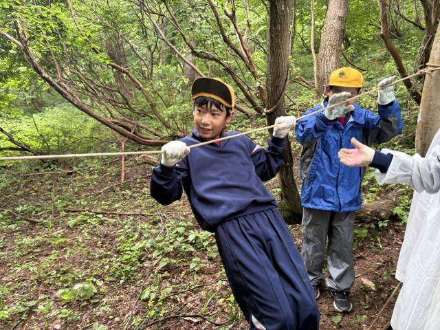 ワイルド遊びの様子です。班の仲間と協力して遊具を作って遊びました。