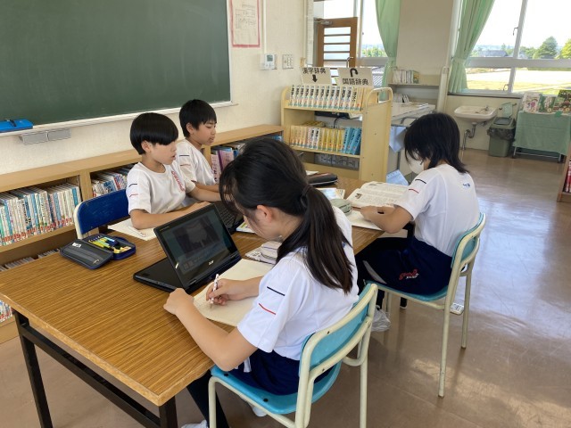 理科では、からだの働きを調べる学習をしています。人体模型を使って、体の中の臓器の位置を確認したり、図書室の本やパソコンを使って、食べ物が吸収される仕組みを調べたりしています。また、実験を通して、唾液の役割や呼吸の仕組みを知りました。