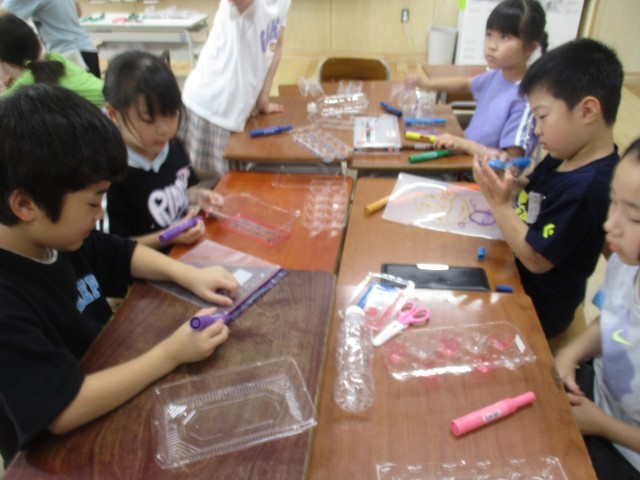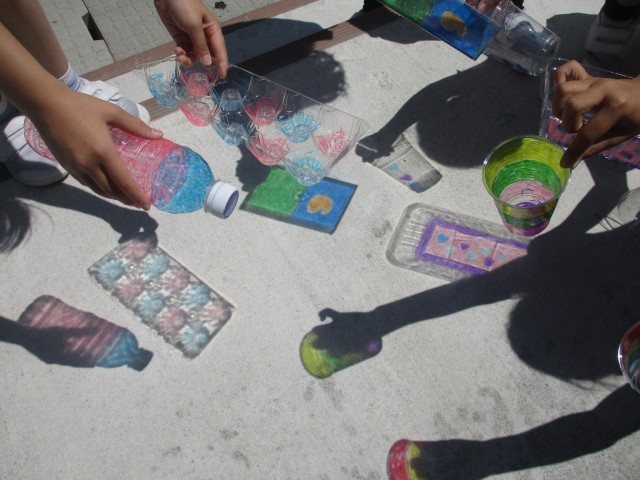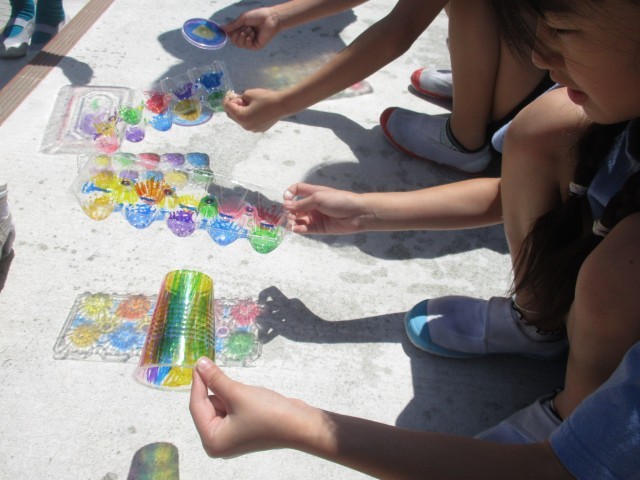 1組でも図画工作科「光のプレゼント」を学習しました。玉子パックやペットボトル等、透明な容器を利用し、色マジックで色や模様を付けました。光を通してどんなふうにうつるかお楽しみ。1回目は、光が弱かったのですが、2回目は、ばっちり、色も形もはっきりときれいにうつり、大喜びでした。この学習を生かし、透明なうちわに夏らしいデザインを考え、カラーのセロハンを貼って、作品を仕上げます。