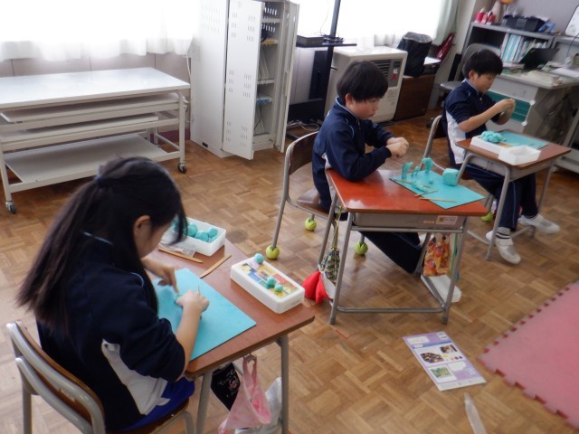 3年生は粘土で町づくりをしていました。お城をつくったり、ブランコをつくったりと、自分が考えた町を粘土で形にしていました。