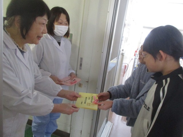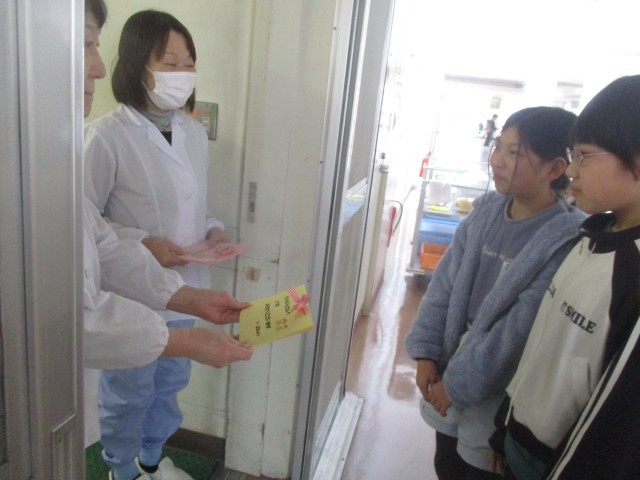 調理員さんへの感謝の手紙を、体つくり委員会の子供たちが届けに行きました。「これからもおいしい給食をよろしくお願いします」