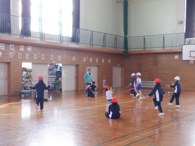 2年生は体育科で縄跳びのかけ足跳びの練習をしていました。リズムに乗って30秒跳び続けられるかチャレンジをしていました。リズムよく縄跳びができると、いろいろな技が上手にできるので、みんながんばっています。