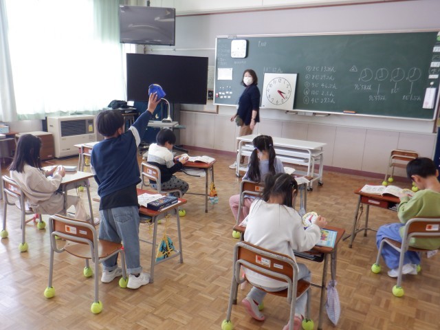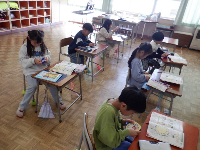 1年生は算数科で時計の学習をしていました。時計を読む練習をした後、先生が提示した時刻を時計で表す練習をしました。細かい「分」の目盛りまでしっかり数えて、早く正しく表すことができるようになりました。できたときは嬉しそうに「できた!」と先生に見せていました。