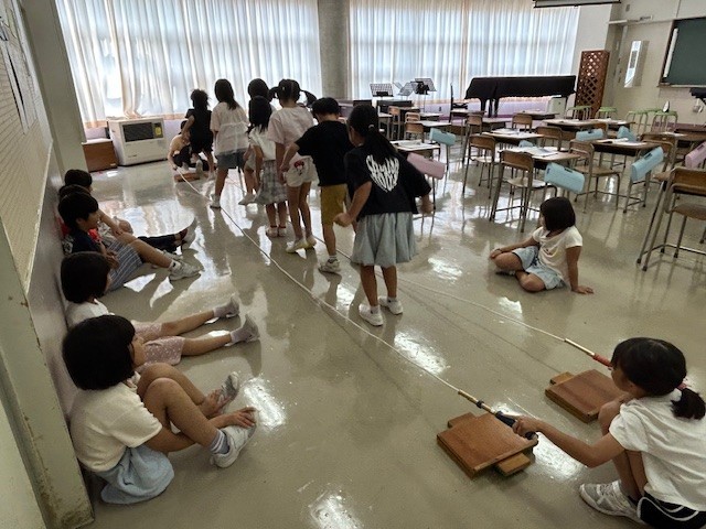 2年生は音楽科で「いるかはざんぶらこ」に合わせてリズム遊びをしていました。リズムに合わせて足を開閉しながらロープを跳び越すのですが、なかなか難しくみんなで声をかけ合いながら練習していました。