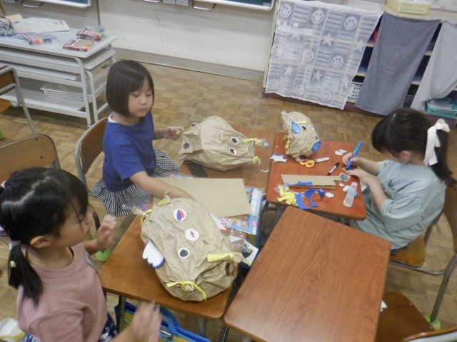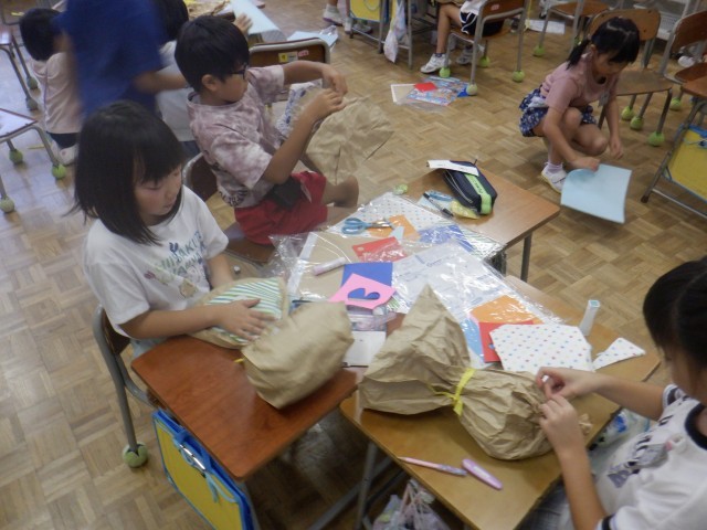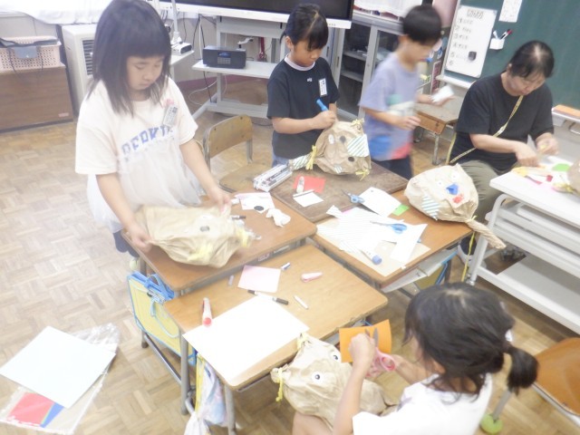 2年生は図画工作科で紙袋を使って「ぎゅっとしたくなるともだち」をつくっていました。紙袋に手を付けたり、耳を付けたり、目を描いたりしてかわいい友達をつくっていました。