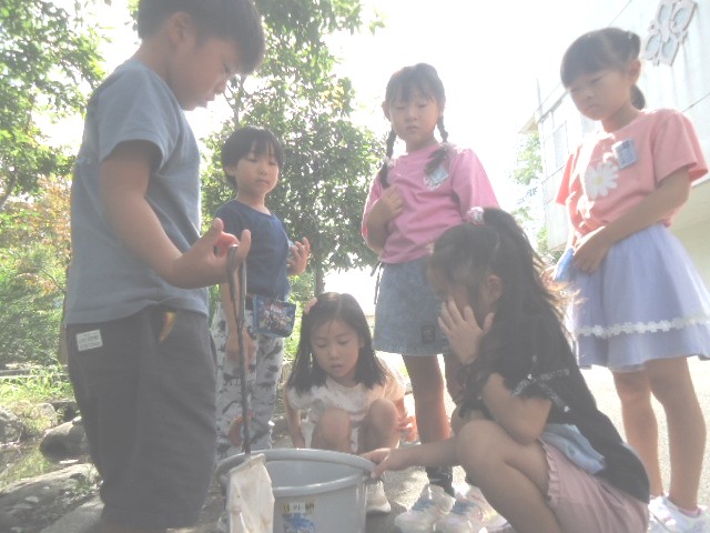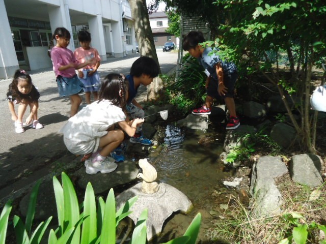 休み時間に、前庭の池でめだかをつかまえました。網ですくいましたが、なかなか入ってくれませんでした