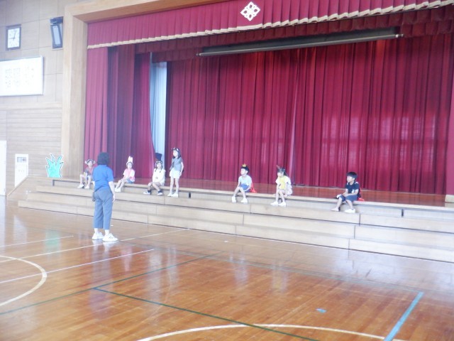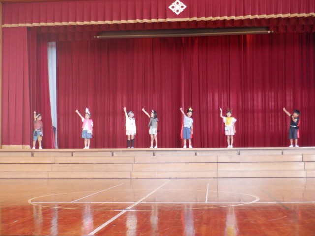 1年生は体育館のステージで学習発表会の練習をしました。みんな大きな声でせりふを言ったり、歌ったりとがんばっています。