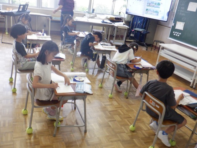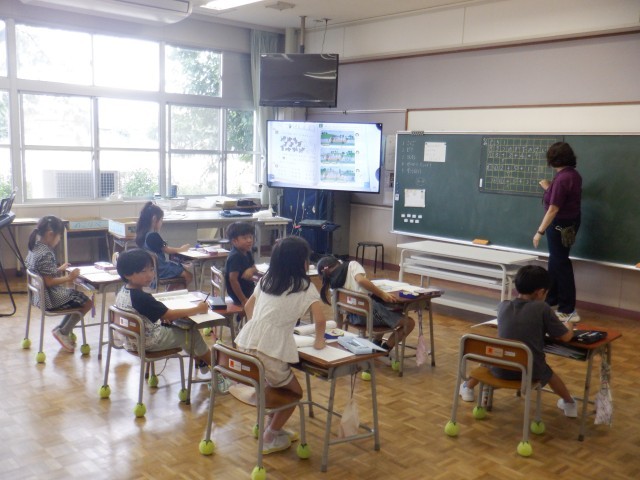 1年生は算数科で3つの数の計算を学習しています。バスに乗ったり、降りたりする物語を見て、バスに乗っている人数を計算します。どの子も自信をもって式を立て、計算していました。