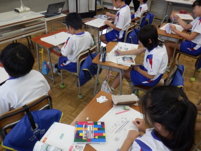 4年生は外国語活動で筆箱の中身を自由に絵で描いて、紹介する学習をしていました。「I have~」の表現を使って、絵を見せながら筆箱の中身の紹介をしていました。